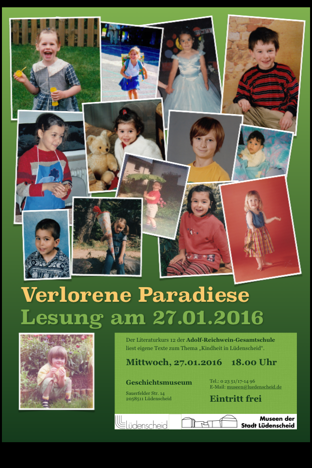 Der Literaturkurs 12 der Städt. Adolf-Reichwein-Gesamtschule trug im Rahmen der Lesung "Verlorene Paradiese" seine eigenen Texte zum Thema "Kindheit in Lüdenscheid" vor. Die Veranstaltung fand im Museum der Stadt Lüdenscheid statt.