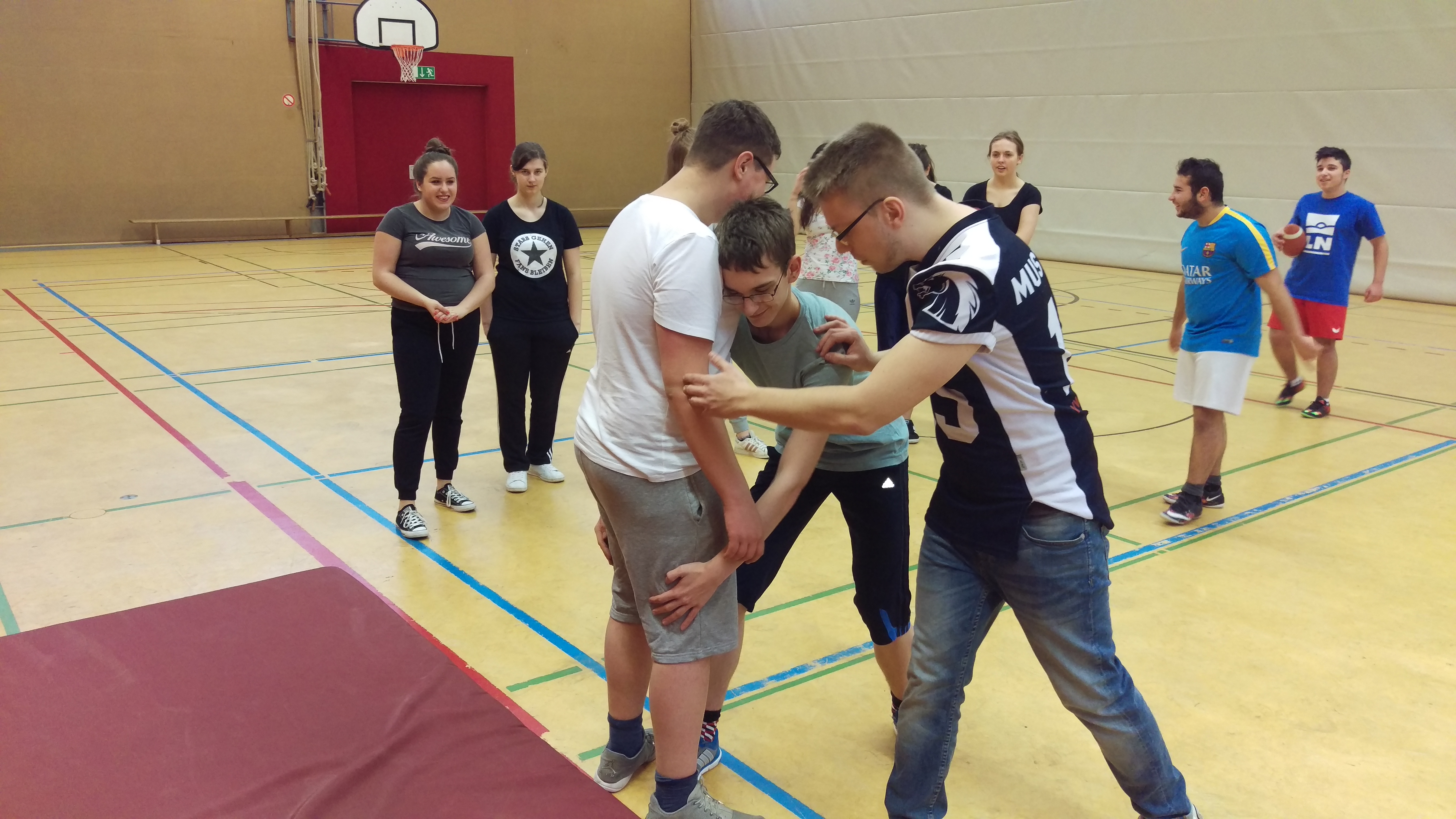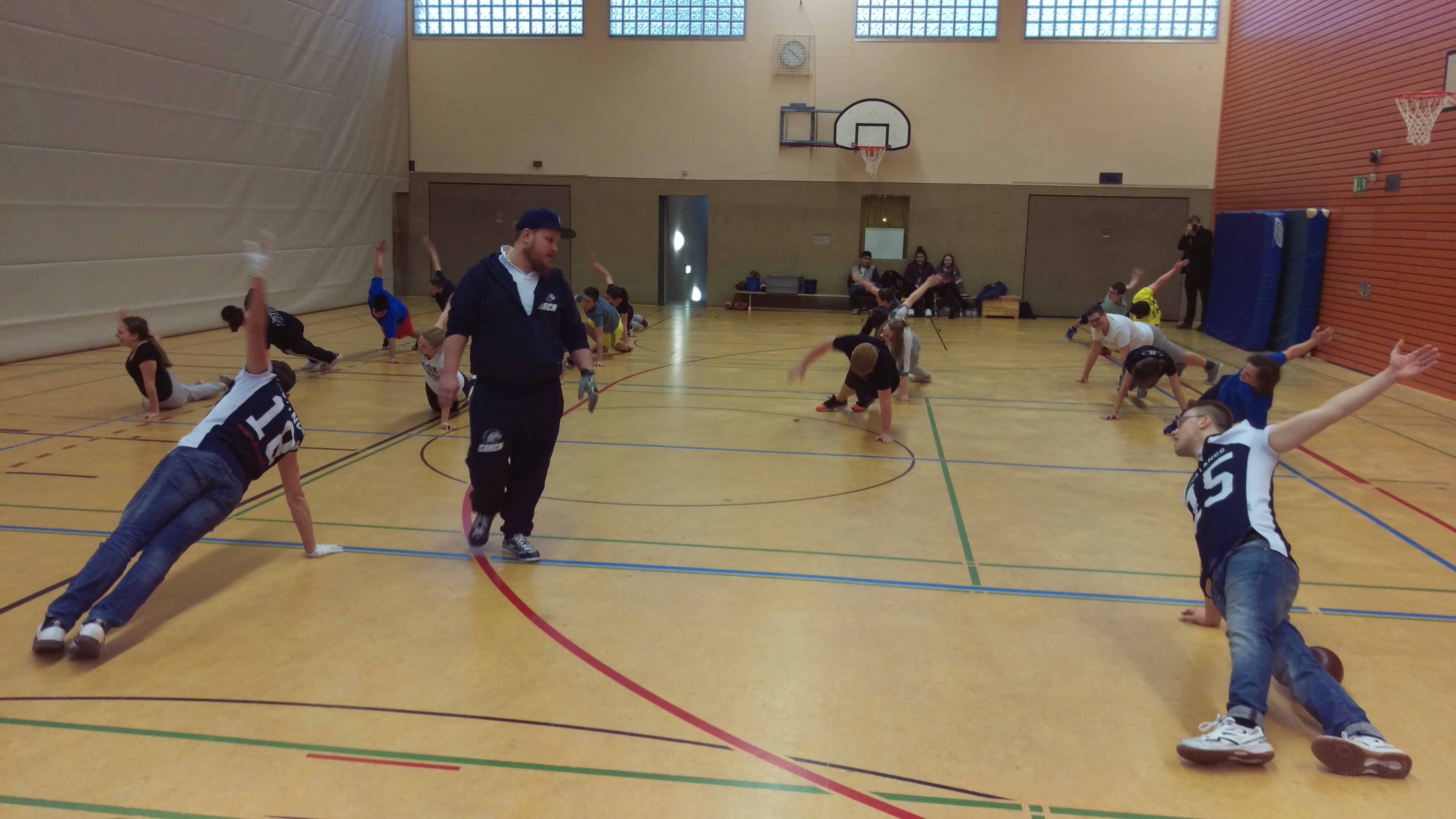 Eine ungewöhnliche Sportstunde erlebte die Klasse 10.4 am Montag nach den Ferien. Im Rahmen der Unterrichtseinheit "An jedem verdammten Sonntag - Eine übungsbezogene und spielkonzept-orientierte Einführung der Grundtechniken beim Flag-Football und Anwendung der erlernten Fertigkeiten in unterschiedlichen Spielformen" bekam die Klasse Besuch vom Assistent HeadCoach der Sauerland Mustangs, Michel Schumann. Gemeinsam mit dem Quarterback und dem Receiver der Football-Mannschaft aus Hagen vermittelte Schumann die Wurf- und Fangtechnik beim American Football sowie Spielzüge im Rahmen der Spielform "Flag-Football".