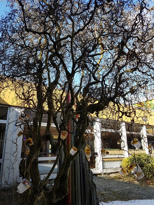 Im Rahmen der Kunst-AG hat die Klasse 5.2 gemeinsam mit ihren Klassenlehrerinnen Frau Vierhaus und Frau Vogel das eiskalte Wetter genutzt, um ein Street-Art-Projekt durchzuführen. Sie setzten sich mit der Idee der Straßenkunst und insbesondere mit deren Vergänglichkeit auseinander. Anschließend gestalteten sie aus Blütenblättern und Wasser, das über Nacht gefror, kleine Eisplastiken und hängten diese in das Atrium der Schule.