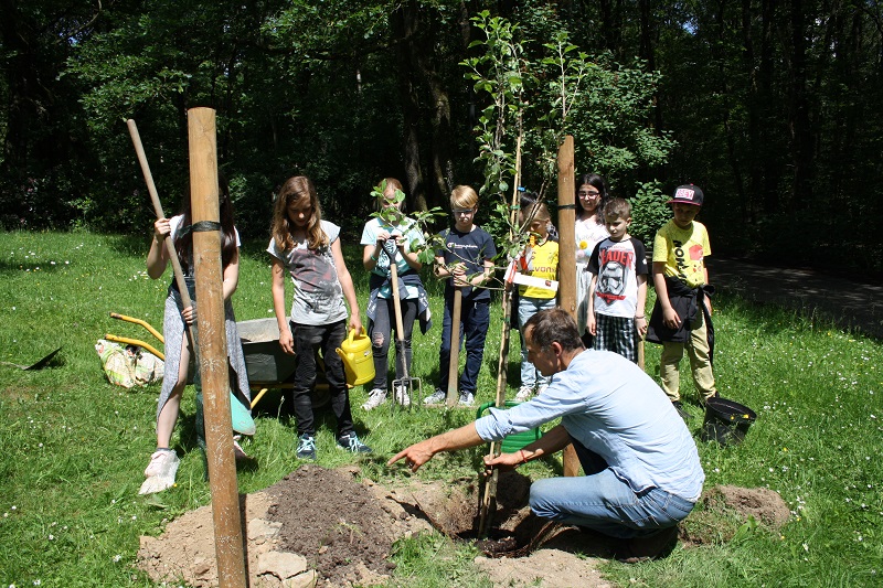 Anlässlich des 750 jährigen Jubiläums der Stadt Lüdenscheid spendete das Naturschutzzentrum des Märkischen Kreises in Zusammenarbeit mit dem Umweltbeirat Lüdenscheid unter der Leitung von Herrn Teutenberg der Adolf-Reichwein-Gesamtschule zwei Apfelbäume. Lehrer David Krimpmann und Volker Knipp pflanzten gemeinsam mit den Schülern der Schularten AG auf der Schulwiese die beiden Bäume ein. Für die Schülerinnen und Schüler war es eine neue Erfahrung, sie lernten unter fachgerechter Anleitung den Baum vor Wühlmäusen und anderen Schädlingen zu schützen. Die fleißigen Helfer bekamen Apfelsaft aus der Vorjahresernte. Die Schülerinnen und Schüler hoffen, dass sie in einigen Jahres ihren eigenen Apfelsaft pressen können.