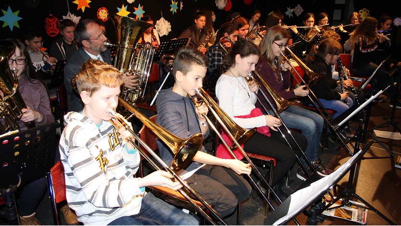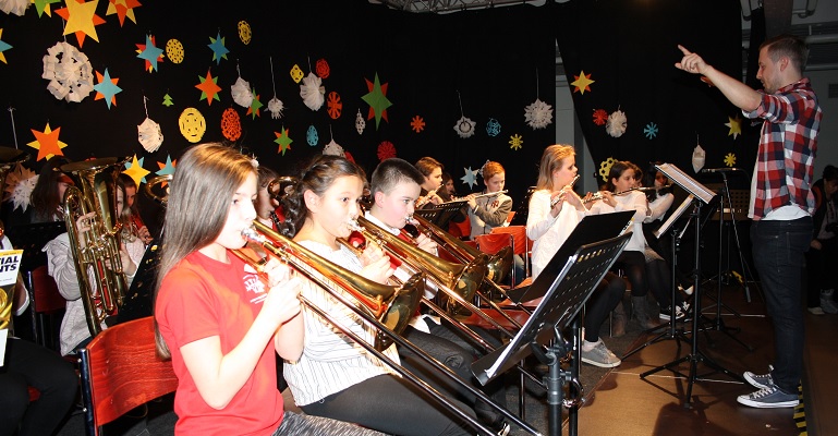 Frau Michalzik (Abteilungsleitung I) und Schulleiter Frank Bisterfeld sowie Mitorganisatoren Herr Hilbrunner (Fachvorsitzender Musik), Herr Krull, Herr Grollmann und Frau Berger führten gemeinsam durch die gelungene festliche Veranstaltung, bei der sich ein lebhafter musikalisch-literarischer Dialog zwischen Weihnachtsgesängen und Chorkompositionen wie „Last Christmas“ und „Feliz Navidad“ der Klassen 5.2, 5.4 und 5.5, musikalischen Beiträgen der Bläserklassen 5.3, 6.5 und 7.1, jeweils begleitet von Musiklehrerinnen und Musiklehrern sowie der Schülerinnen Christina und Danai Gravou auf der einen und Gedichten des Faches Darstellen und Gestalten der Jahrgangsstufe 7 unter Leitung von Herrn Schmitz auf der anderen Seite ergab. Das Konzert vermittelte auf hohem musikalischem Niveau, was u.a. Schülerinnen und Schüler der Bläserklassen durch die intensive Förderung im Rahmen des Profils „Musikforscher-Klasse“ erreichen können.