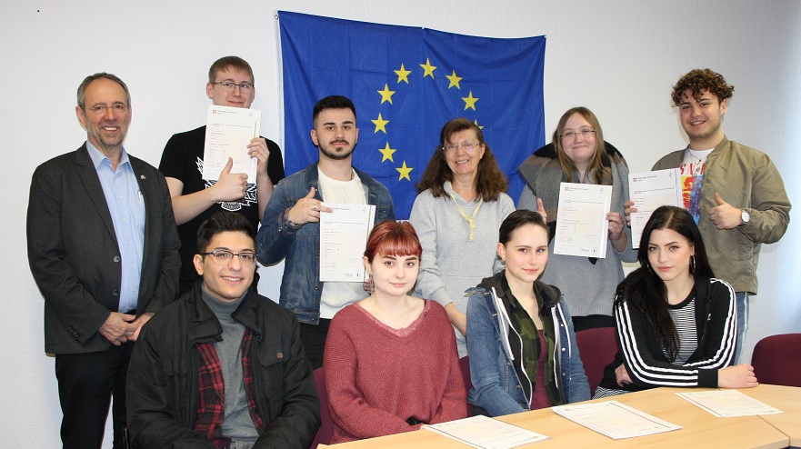 Acht Schülerinnen und Schüler der Städtischen Adolf-Reichwein-Gesamtschule haben erfolgreich eine anspruchsvolle Sprachprüfung der University of Cambridge abgelegt, auf die sie sich eineinhalb Jahre lang im Rahmen eines Projektkurses und im freiwilligen Einsatz während ihrer Freistunden vorbereitet haben. Schulleiter Frank Bisterfeld (links) gratuliert den Schülerinnen und Schülern recht herzlich. Sein besonderer Dank galt auch Frau Astrid Ebnicher. Mit großem persönlichen Einsatz betreut sie als zuständige Englischlehrerin bereits seit 2012 jedes Jahr eine Gruppe interessierter Schülerinnen und Schüler.