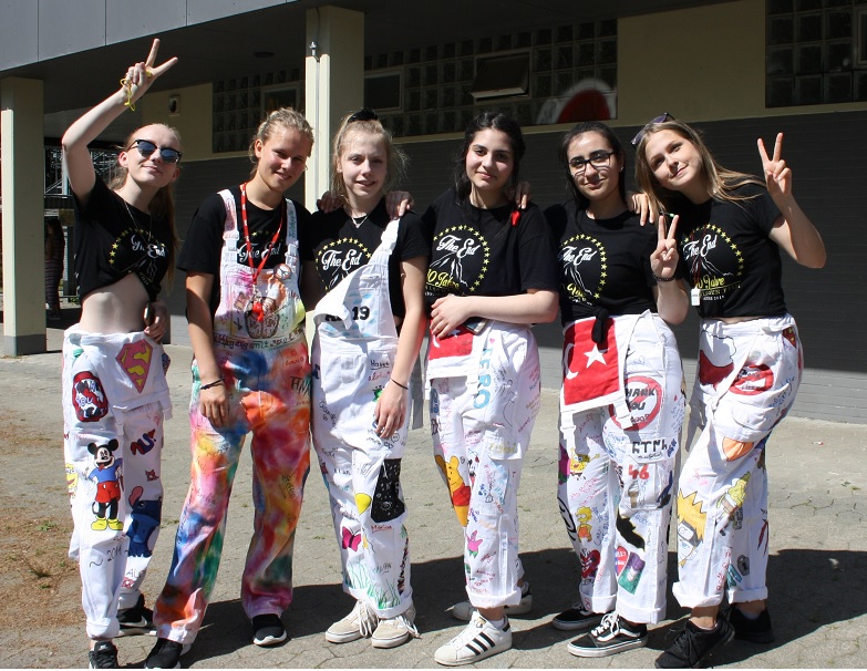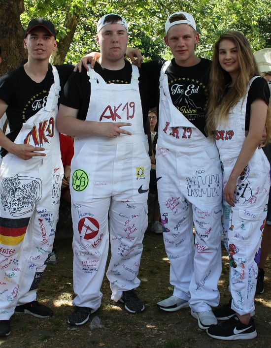 Endlich! Der letzte Schultag ist die Party. 163 Schülerinnen und Schüler des 10. Jahrganges feierten an ihrem letzten Schultag, am Dienstag, 25.06.2019, bei bestem Wetter und guter Stimmung. Wie jedes Jahr glänzten zahlreiche Schülerinnen und Schüler mit ihren selbst gestalteten Latzhosen. Für gute Stimmung sorgte eine mobile Disco, die auf dem unteren Schulhof den Mittelpunkt der ausgelassenen Party bildete.
