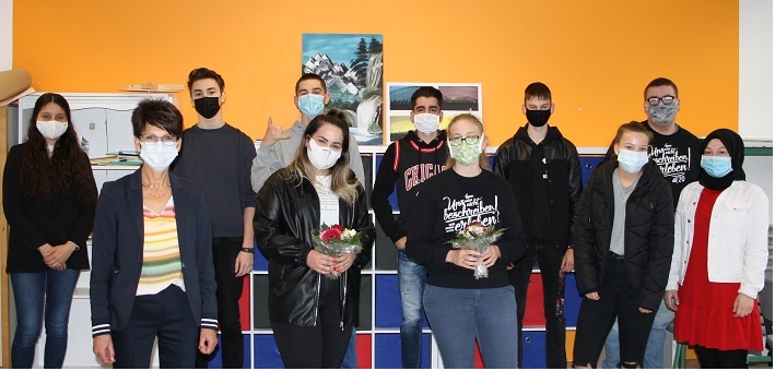 Der jahrgangsbeste Schüler ist Dimitrios Argiriou (10.6), die beste Schülerin Adelina König (10.4). Abteilungsleiterin Frau Reich-Geck ließ es sich nicht nehmen, allen 163 Zehntklässlern einen Besuch abzustatten und anlässlich der Zeugnis-übergabe zu gratulieren. Einen mittleren Schulabschluss mit Qualifikation erreichten 43, einen Mittleren Schulabschluss 37, einen Hauptschulabschluss (nach Klasse 10) 73 und einen Hauptschulabschluss insgesamt 6 Schülerinnen und Schüler.